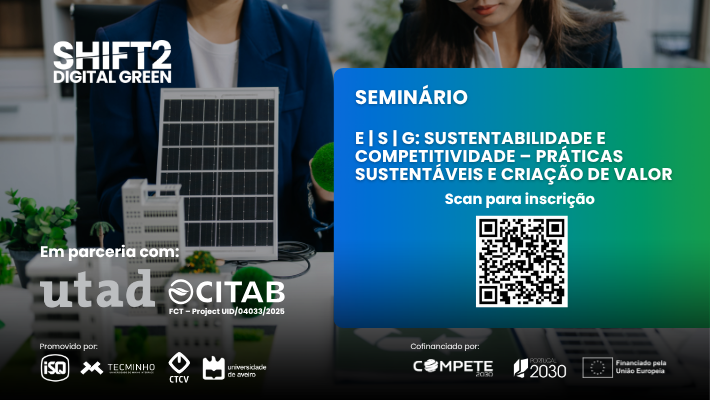 Ao abrigo do projeto SHIFT2DigitalGreen – Promoção de fatores críticos para a transição digital e verde (operação COMPETE2030-FEDER-01275900) financiado pelo Portugal 2030, o ISQ – Instituto de Soldadura e Qualidade promove, em pareceria com a Universidade de Trás-os-Montes e Alto Douro (UTAD), no próximo dia 20 de maio, o seminário “E | S | G: Sustentabilidade e Competitividade – Práticas sustentáveis e criação de valor”. A iniciativa tem como objetivo apoiar na divulgação, na compreensão e integração de práticas ESG (Environmental, Social and Governance) nas empresas.